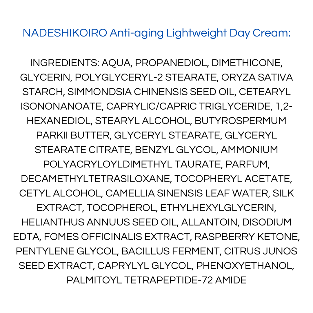 Inhaltsstoffe wie Yuzu, die die Barrierefunktion der Haut verbessert, Skinarch, bekannt als Architekt der Haut, Pore Reductyl NT, das adstringierende und straffende Eigenschaften hat, weißer Tee, Vitamin E, Sirtalice und Moripure Silk sorgen dafür, dass diese Anti-Ageing-Tagescreme für fettige Haut das Erscheinungsbild von Falten im Gesicht deutlich minimiert. Die Anti-Ageing-Gesichtscreme von Nadeshikoiro verbessert außerdem die Geschmeidigkeit, Leuchtkraft und Dichte der Haut.